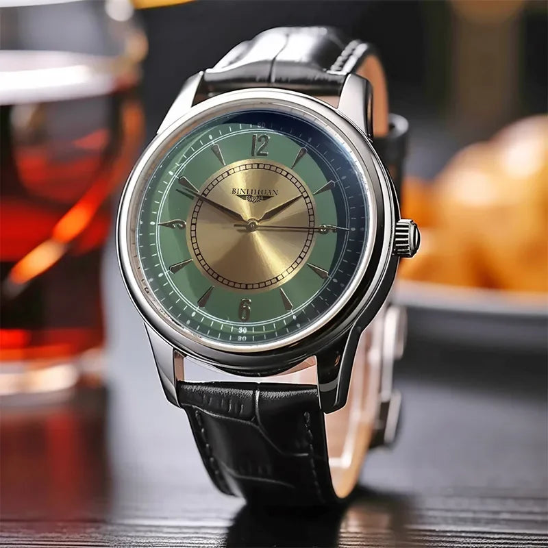 A refined quartz wristwatch with a clean dial and leather strap, designed for everyday wear with timeless presence. Finished with subtle markers and a waterproof case, it embodies quiet precision and everyday reliability.